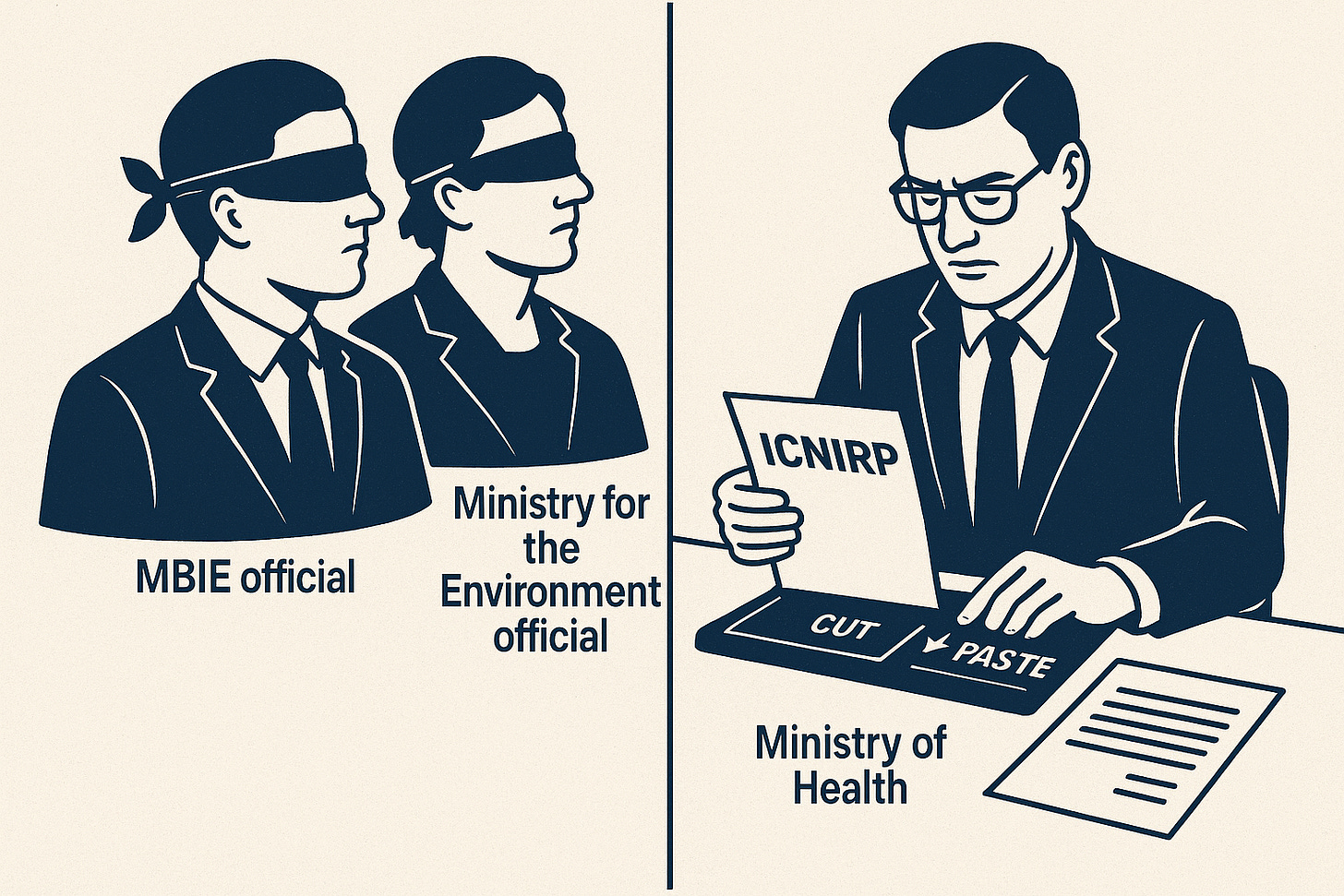 Historically, agencies tasked with caring for environment and human health would hold powers of stewardship of man-made technologies. However, in New Zealand, business-facing MBIE, as we have discussed, secured control of telecommunications RF-EMF National Environmental Standards for Telecommunication Facilities regulations. Unauthored reports by a secretive Ministry of Health (MoH) committee then provide the justification for retaining 1999 standards in MBIE’s regulations.