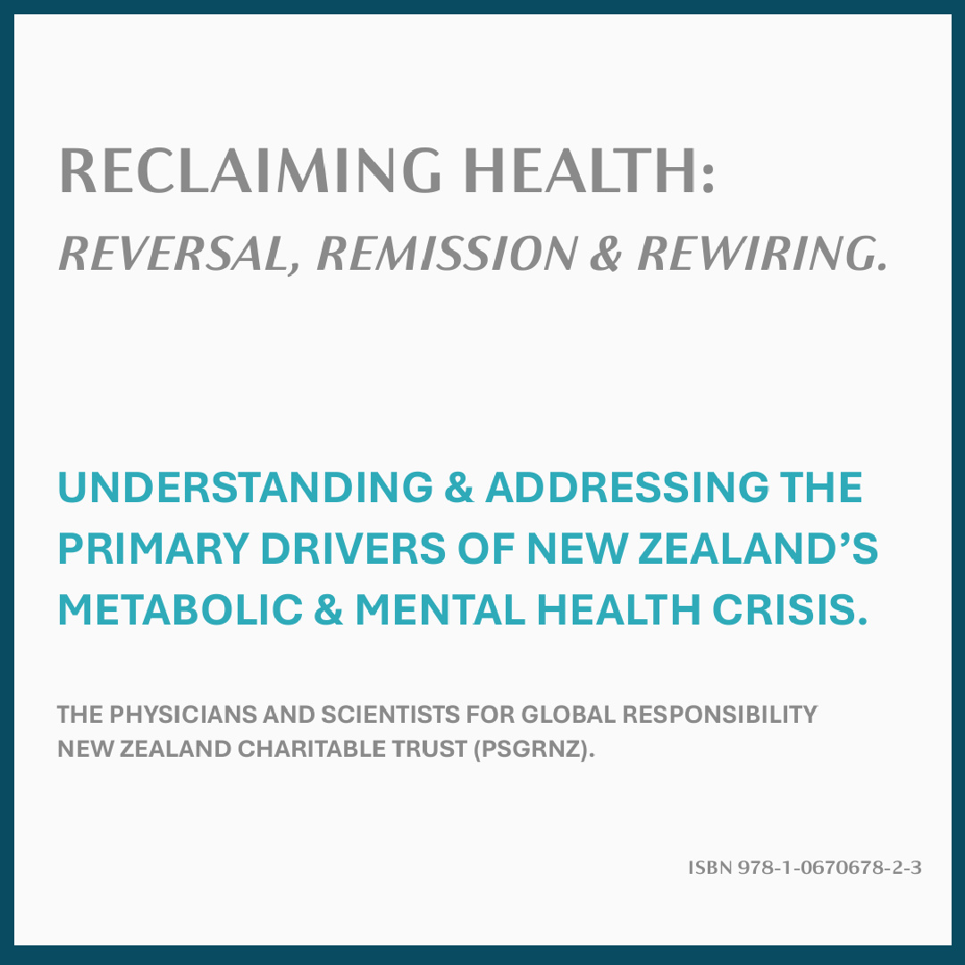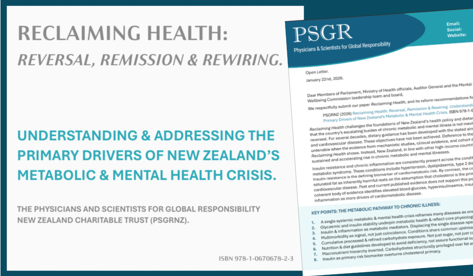 REPORT: PSGRNZ (2026) Reclaiming Health: Reversal, Remission & Rewiring. Understanding & Addressing the Primary Drivers of New Zealand’s Metabolic & Mental Health Crisis. Bruning, J.R., Physicians & Scientists for Global Responsibility New Zealand. ISBN 978-1-0670678-2-3.  3 page summary + Recommendations.
